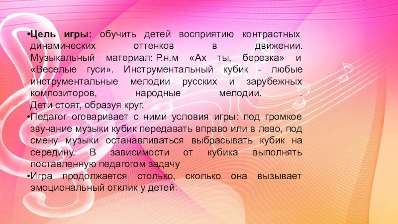 Слайд 13Цель игры: обучить детей восприятию контрастных динамических оттенков в движении.