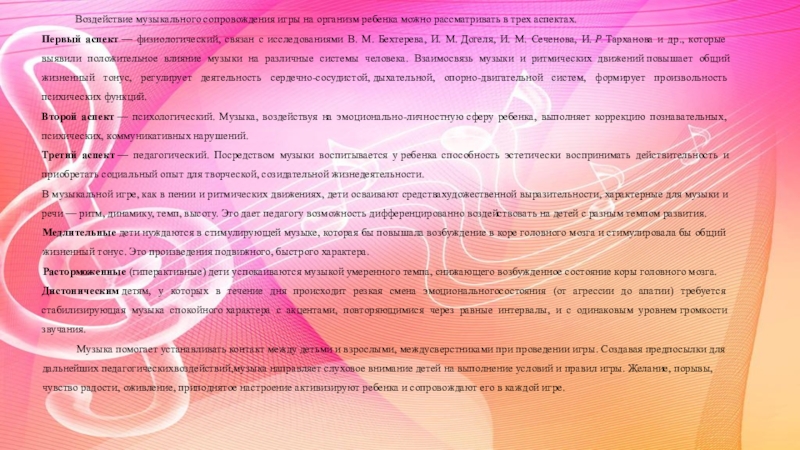 Слайд 6Воздействие музыкального сопровождения игры на организм ребенка можно рассматривать в трех