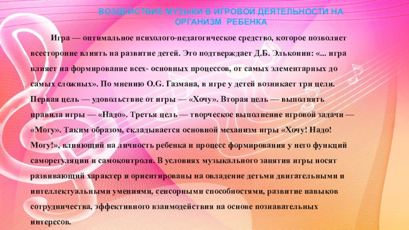 средство, которое позволяет всесторонне влиять на развитие детей. Это подтверждает Д.Б. Эльконин: «... игра влияет на формирование всех- основных процессов, от самых элементарных до самых сложных». По мнению O.G. Газмана, в игре у детей возникает три цели. Первая цель — удовольствие от игры — «Хочу». Вторая цель — выполнять правила игры — «Надо». Третья цель — творческое выполнение игровой задачи — «Могу». Таким образом, складывается основной механизм игры «Хочу! Надо! Могу!», влияющий на личность ребенка и процесс формирования у него функций саморегуляции и самоконтроля. В условиях музыкального занятия игры носят развивающий характер и ориентированы на овладение детьми двигательными и интеллектуальными умениями, сенсорными способностями, развитие навыков сотрудничества, эффективного взаимодействия на основе познавательных интересов.