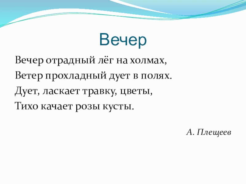ВечерВечер отрадный лёг на холмах,Ветер прохладный дует в полях.Дует, ласкает травку, цветы,Тихо качает розы кусты.А. Плещеев