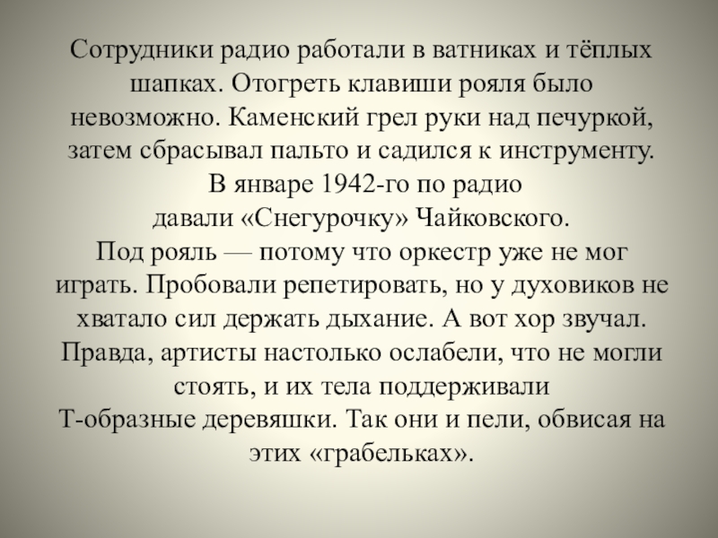 Слайд 15Сотрудники радио работали в ватниках и тёплых шапках. Отогреть клавиши рояля
