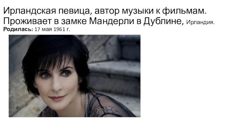 Слайд 11Ирландская певица, автор музыки к фильмам. Проживает в замке Мандерли в