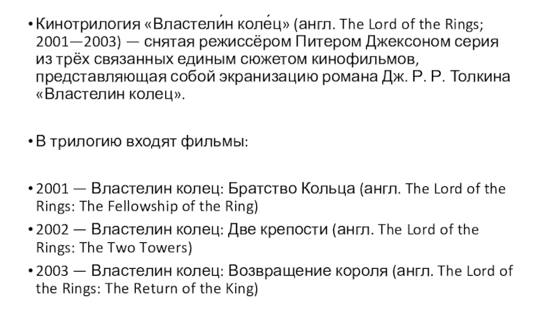 Слайд 7Кинотрилогия «Властели́н коле́ц» (англ. The Lord of the Rings; 2001—2003) —