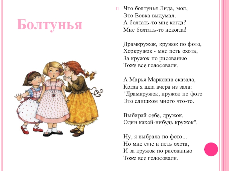 БолтуньяЧто болтунья Лида, мол, Это Вовка выдумал. А болтать-то мне когда? Мне болтать-то некогда!  Драмкружок, кружок