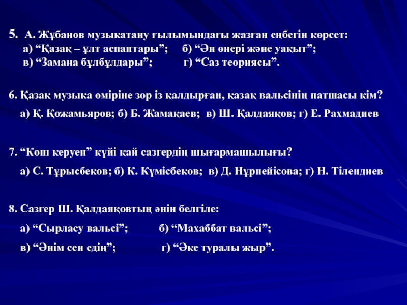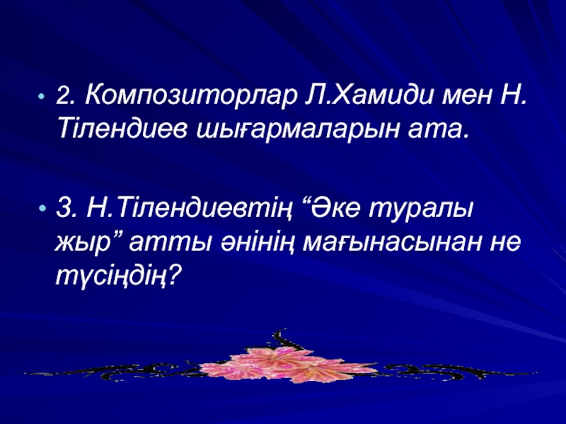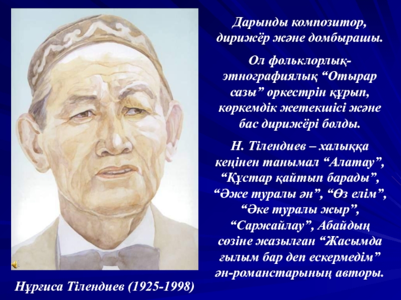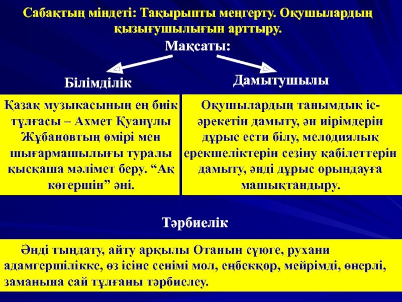 Әнді тыңдату, айту арқылы Отанын сүюге, рухани адамгершілікке, өз ісіне сенімі мол, еңбекқор, мейрімді, өнерлі, заманына сай тұлғаны тәрбиелеу.