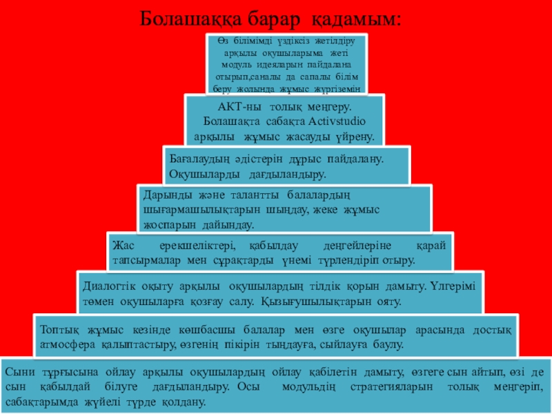 Өз білімімді үздіксіз жетілдіру арқылы оқушыларыма жеті модуль идеяларын пайдалана отырып,саналы да сапалы білім беру жолында жұмыс жүргіземін