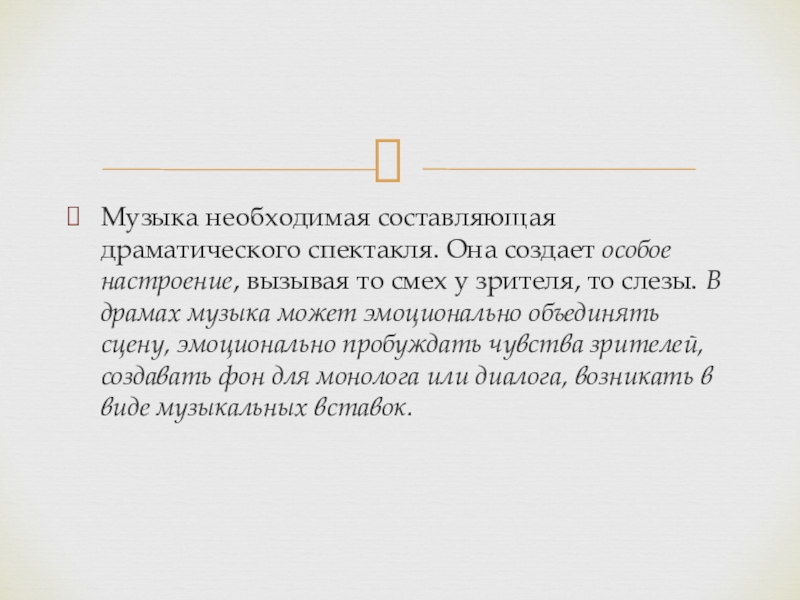 Слайд 4Музыка необходимая составляющая драматического спектакля. Она создает особое настроение, вызывая то