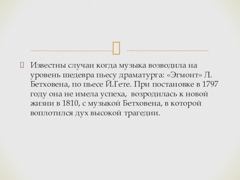 Слайд 6Известны случаи когда музыка возводила на уровень шедевра пьесу драматурга: «Эгмонт»