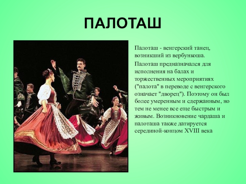 на балах и торжественных мероприятиях ("палота" в переводе с венгерского означает "дворец"). Поэтому он был более умеренным и сдержанным, но тем не менее все еще быстрым и живым. Возникновение чардаша и палоташа также датируется серединой-концом XVIII века