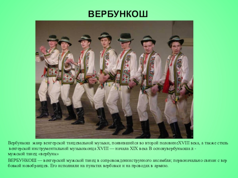 Вербункош жанр венгерской танцевальной музыки, появившийся во второй половинеXVIII века, а также стиль венгерской инструментальной музыкиконца XVIII — начала XIX века В основувербункоша л - мужской танец «вербунк»