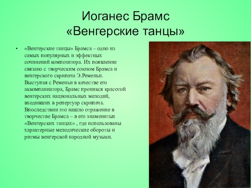 и эффектных сочинений композитора. Их появление связано с творческим союзом Брамса и венгерского скрипача Э.Ременьи. Выступая с Ременьи в качестве его аккомпаниатора, Брамс проникся красотой венгерских национальных мелодий, входивших в репертуар скрипача. Впоследствии это нашло отражение в творчестве Брамса – в его знаменитых «Венгерских танцах» , где использованы характерные мелодические обороты и ритмы венгерской народной музыки.