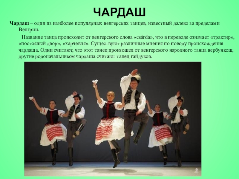 Слайд 16Танец чардаш по составу исполнителей принадлежит к смешанным: его танцуют и