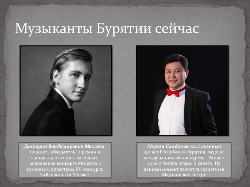 Мэргэн Санданов–заслуженный артист Республики Бурятия, лауреат международный конкурсов . Раннее солист театра оперы и балета. На данный момент является солистом в Мариинском театре