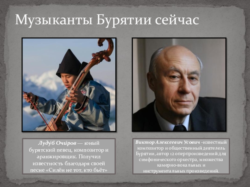 Виктор Алексеевич Усович -известный композитор и общественный деятелель Бурятии, автор 12 оперпроизведений для симфонического оркестра, множества камерно-вокальных и инструментальных произведений.