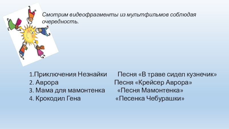 Смотрим видеофрагменты из мультфильмов соблюдая очередность.