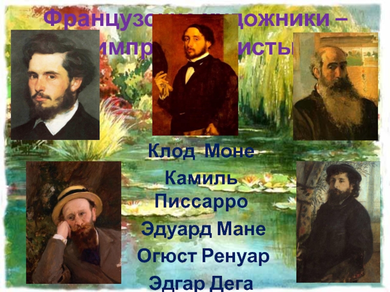 Французские художники – импрессионистыКлод Моне Камиль Писсарро Эдуард Мане Огюст Ренуар Эдгар Дега