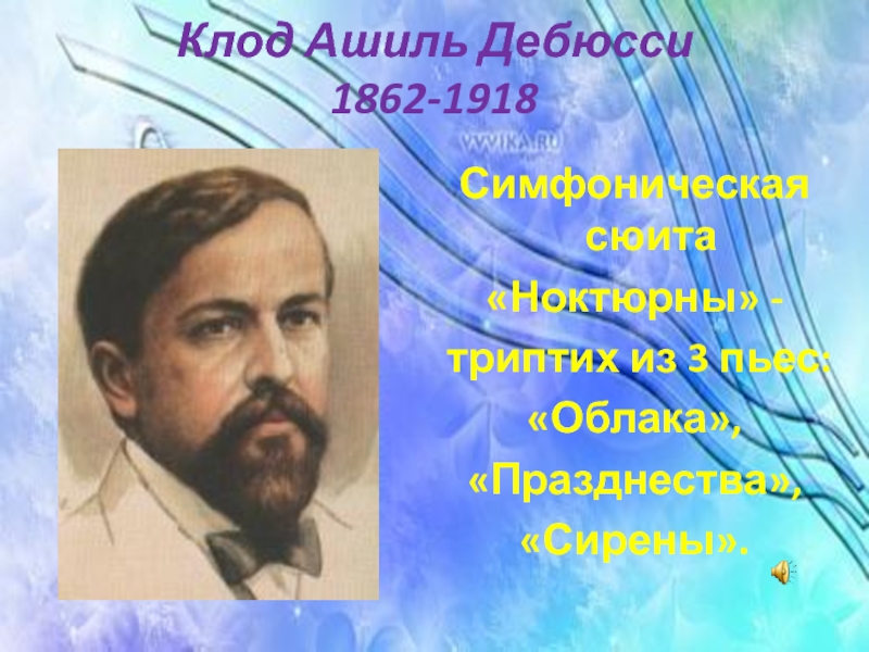 Клод Ашиль Дебюсси 1862-1918Симфоническая сюита«Ноктюрны» - триптих из 3 пьес:«Облака»,«Празднества»,«Сирены».