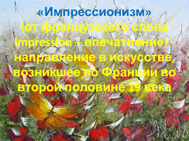 «Импрессионизм» (от французского слова impression – впечатление) -направление в искусстве, возникшее во Франции во второй половине 19