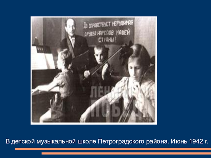 Слайд 4В детской музыкальной школе Петроградского района. Июнь 1942 г.