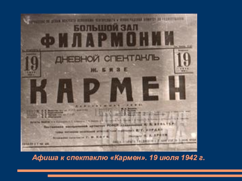 Слайд 3Афиша к спектаклю «Кармен». 19 июля 1942 г.