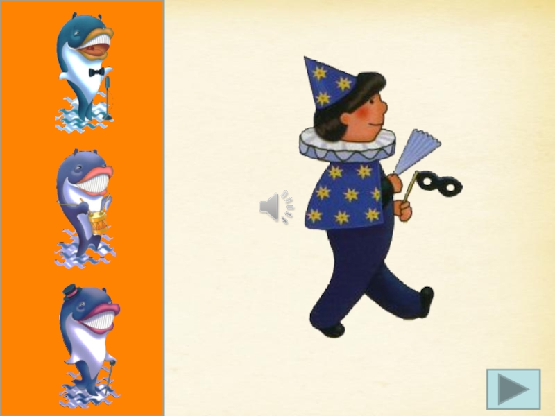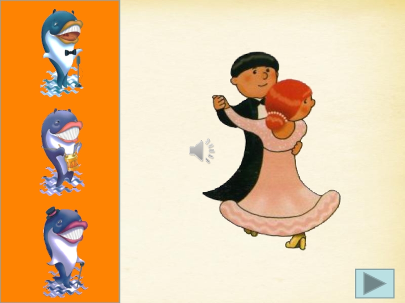 Задание.Рассмотрите картинки «китов»: песня, марш, танец.Прослушайте музыкальный фрагмент.Определите жанр.Нажмите в левой стороне экрана на правильную картинку.Если задание выполнено верно, то в центре появиться картинка исполнителей.