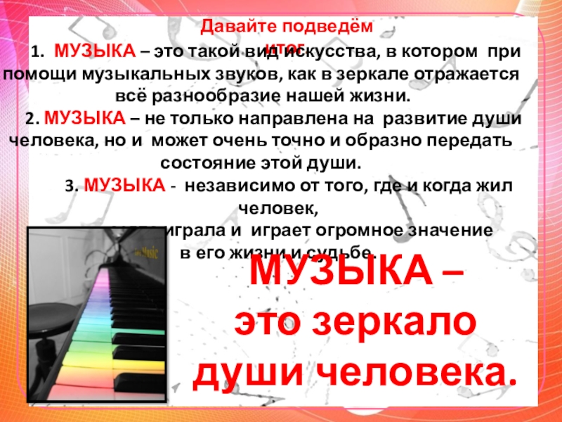 1. МУЗЫКА – это такой вид искусства, в котором при помощи музыкальных звуков, как в зеркале отражается