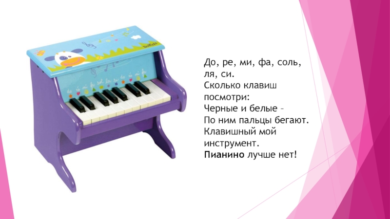 До, ре, ми, фа, соль, ля, си. Сколько клавиш посмотри: Черные и белые –  По ним пальцы