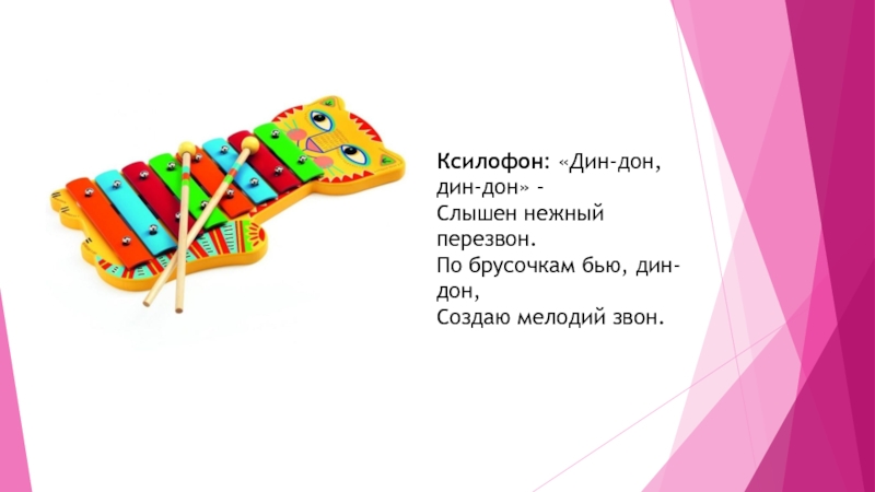 Слайд 6Ксилофон: «Дин-дон, дин-дон» - Слышен нежный перезвон. По брусочкам бью, дин-дон, Создаю мелодий звон.