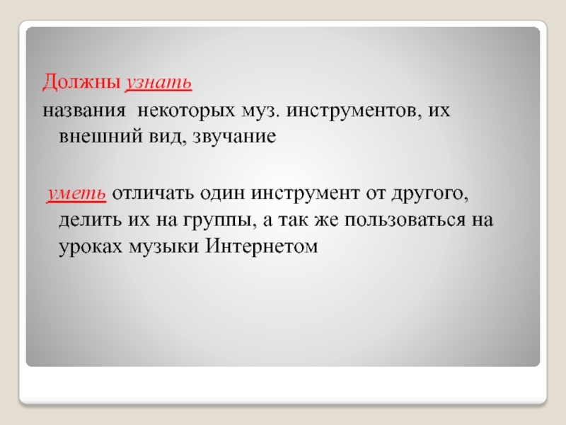 Должны узнать названия некоторых муз. инструментов, их внешний вид, звучание уметь отличать один инструмент от другого, делить