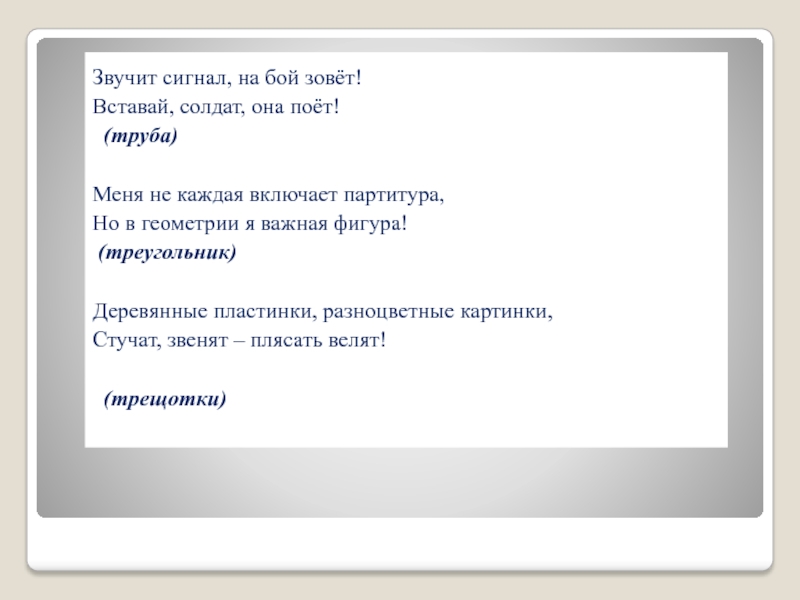 Звучит сигнал, на бой зовёт!Вставай, солдат, она поёт!                                                              (труба)Меня не каждая включает партитура,Но в геометрии я важная фигура!    (треугольник) Деревянные