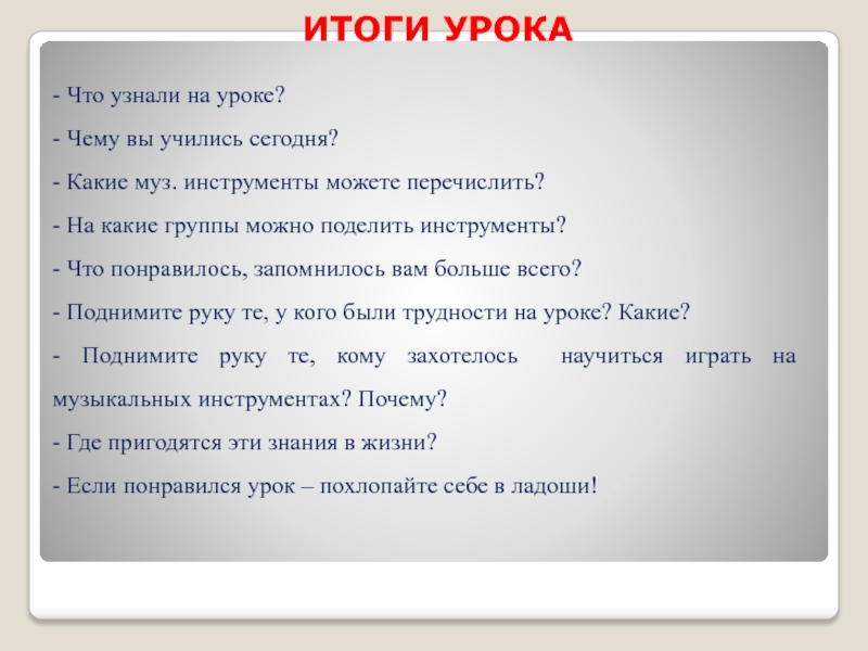 ИТОГИ УРОКА- Что узнали на уроке? - Чему вы учились сегодня? - Какие муз. инструменты можете перечислить?