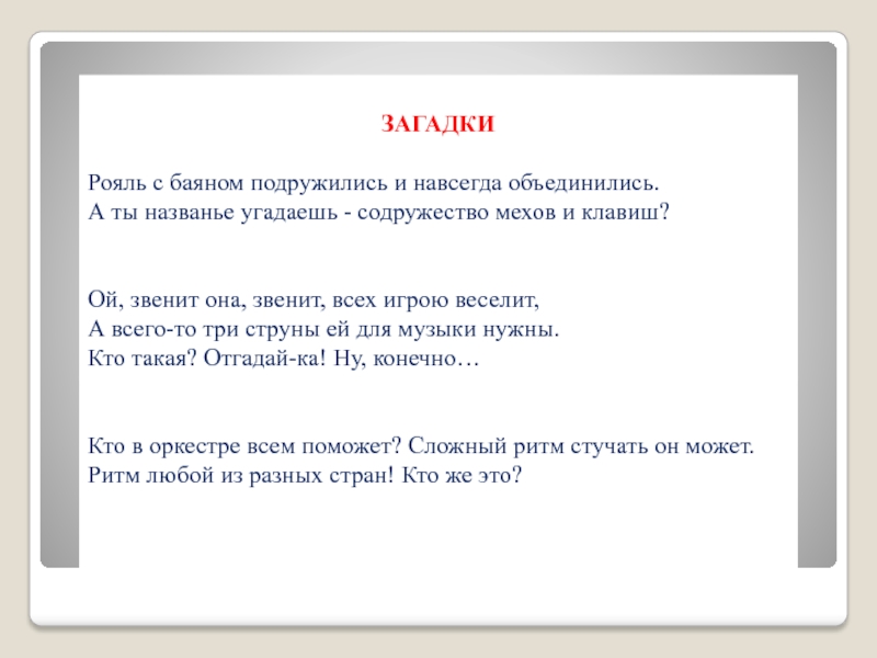 ЗАГАДКИРояль с баяном подружились и навсегда объединились.А ты названье угадаешь - содружество мехов и клавиш? Ой, звенит