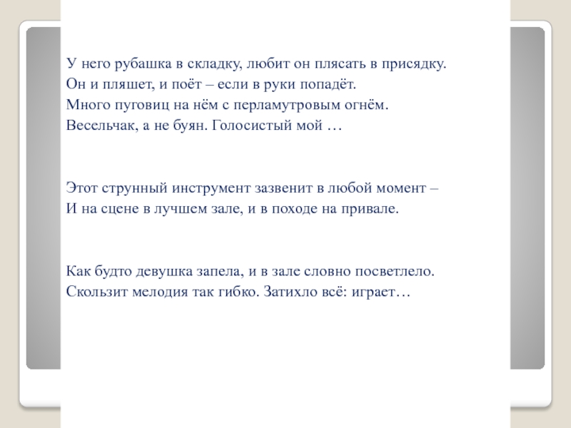 У него рубашка в складку, любит он плясать в присядку.Он и пляшет, и поёт – если в