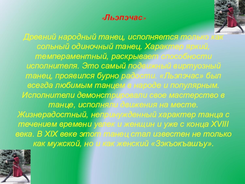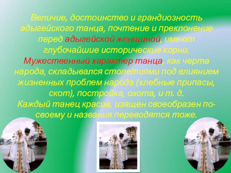 Слайд 19Величие, достоинство и грандиозность адыгейского танца, почтение и преклонение перед адыгейской