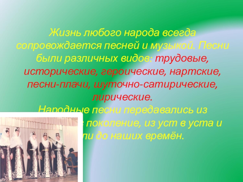 Слайд 14Жизнь любого народа всегда сопровождается песней и музыкой. Песни были различных
