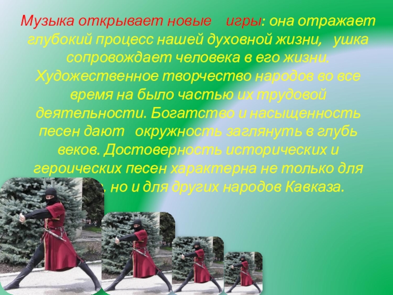 Слайд 9Музыка открывает новые игры: она отражает глубокий процесс нашей духовной
