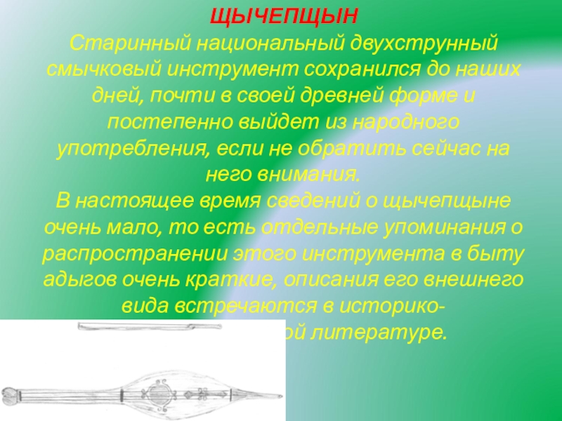 В настоящее время сведений о щычепщыне очень мало, то есть отдельные упоминания о распространении этого инструмента в быту адыгов очень краткие, описания его внешнего вида встречаются в историко-этнографической литературе.