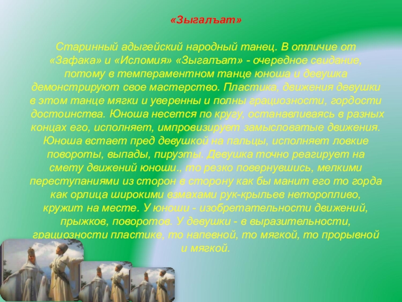 Старинный адыгейский народный танец. В отличие от «Зафака» и «Исломия» «Зыгалъат»