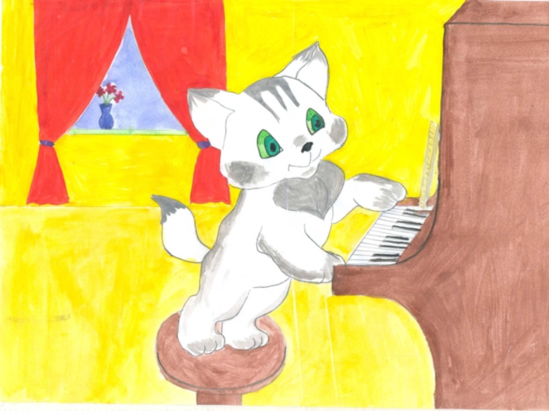 Проснулся наш герой – котик –сон сразу от него отошел, и вот он гордый, увидав пианино пополз на него, как буд-то умеет… Но он мяукает и вспоминает все, что ему хочется. А что, как вы думаете?