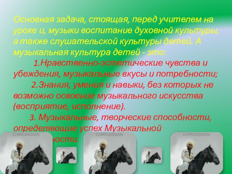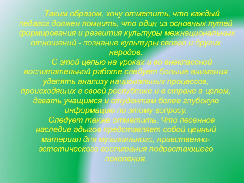 Следует также отметить. Что песенное наследие адыгов представляет собой ценный материал для музыкального, нравственно-эстетического воспитания подрастающего поколения.