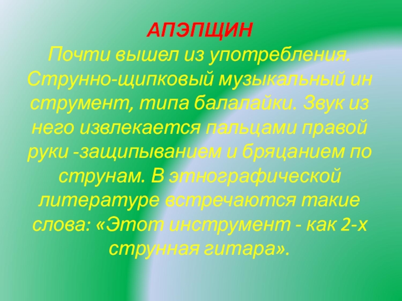 Почти вышел из употребления. Струнно-щипковый музыкальный инструмент, типа балалайки. Звук из