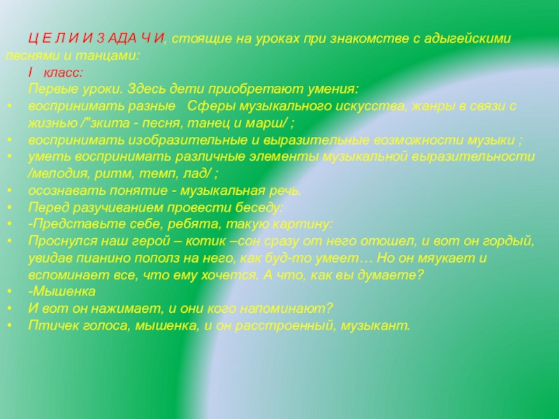 Первыми произведениями, знакомящими ребёнка с родным языком, является колыбельные песни, исполняемые матерью и другими взрослыми в доме, потешки и прибаутки. Дальнейшее развитие культуры, интернациональное по форме и национальное по содержанию, не может плодотворно развиваться без изучения и внедрения в жизнь народного творчества. Поэтому в программу по музыке я включила много вопросов адыгского народного творчества.
