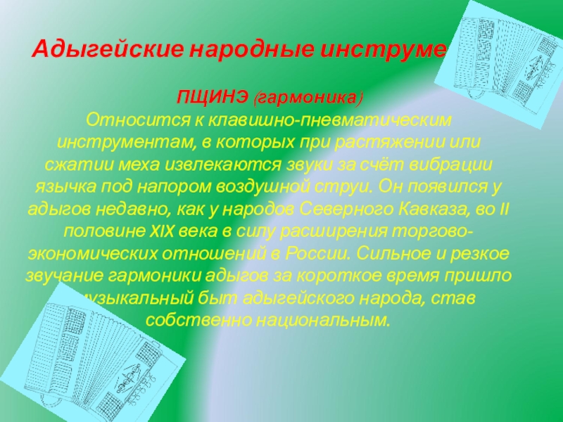 или сжатии меха извлекаются звуки за счёт вибрации язычка под напором воздушной струи. Он появился у адыгов недавно, как у народов Северного Кавказа, во II половине XIX века в силу расширения торгово-экономических отношений в России. Сильное и резкое звучание гармоники адыгов за короткое время пришло в музыкальный быт адыгейского народа, став собственно национальным.