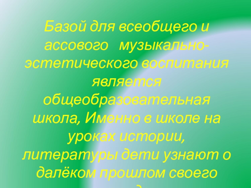 Слайд 12Базой для всеобщего и ассового музыкально-эстетического воспитания является общеобразовательная школа,