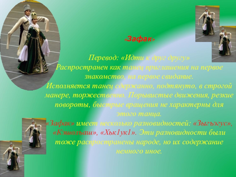 осетин, кабардинцев, черкесов, которые исполняют под различную подвижную танцевальную музыку.