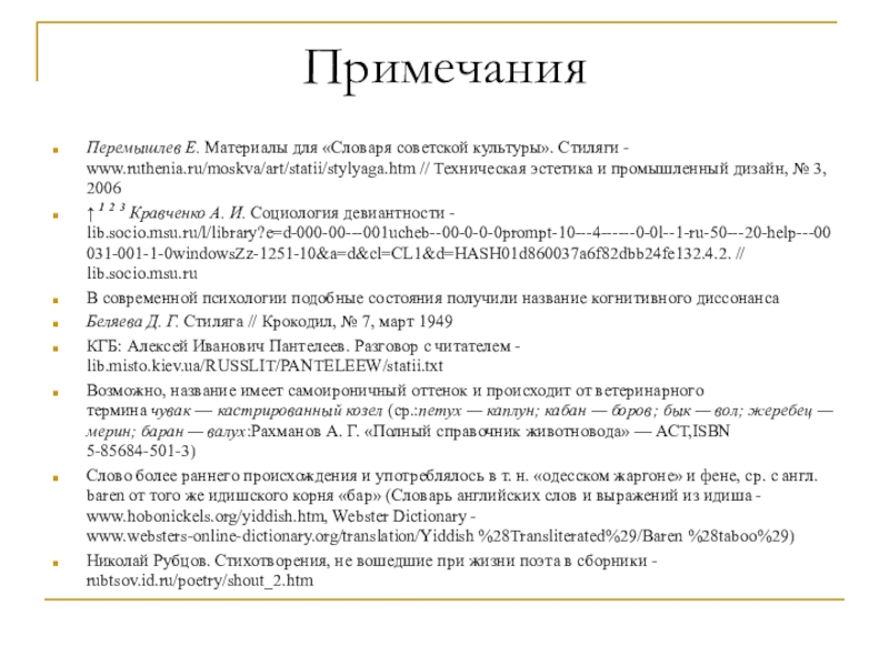 Перемышлев Е. Материалы для «Словаря советской культуры». Стиляги - www.ruthenia.ru/moskva/art/statii/stylyaga.htm // Техническая