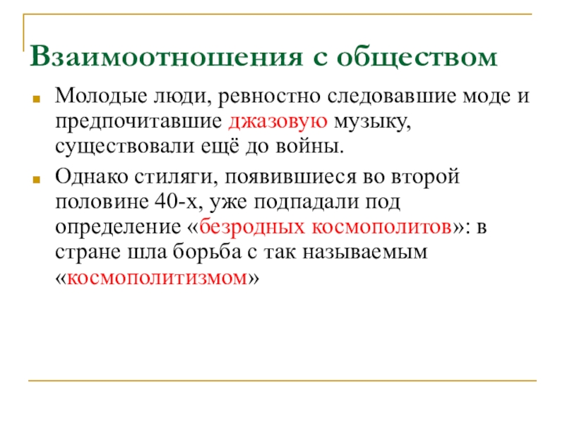 Однако стиляги, появившиеся во второй половине 40-х, уже подпадали под определение «безродных космополитов»: в стране шла борьба с так называемым «космополитизмом»