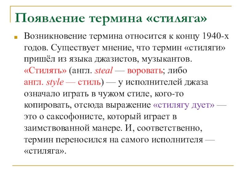 что термин «стиляги» пришёл из языка джазистов, музыкантов. «Стилять» (англ. steal — воровать; либо англ. style — стиль) — у исполнителей джаза означало играть в чужом стиле, кого-то копировать, отсюда выражение «стилягу дует» — это о саксофонисте, который играет в заимствованной манере. И, соответственно, термин переносился на самого исполнителя — «стиляга».