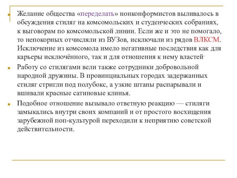 Слайд 11Желание общества «переделать» нонконформистов выливалось в обсуждения стиляг на комсомольских и студенческих собраниях,