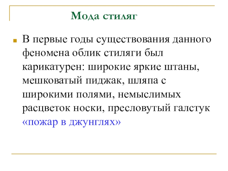 В первые годы существования данного феномена облик стиляги был карикатурен: широкие яркие штаны, мешковатый пиджак, шляпа с широкими полями, немыслимых расцветок носки, пресловутый галстук «пожар в джунглях»